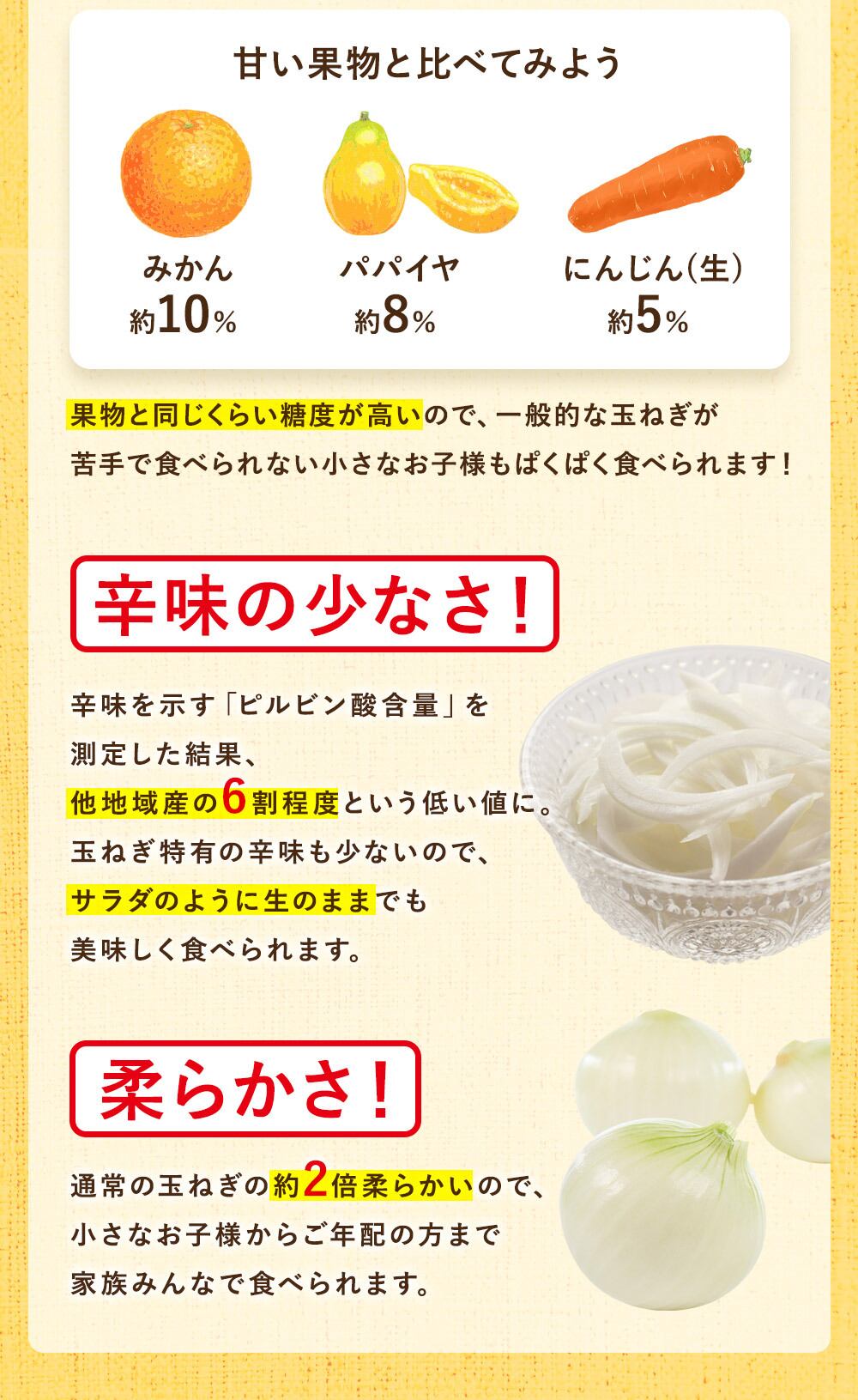 ・農薬に関しては甘味が最大限増すように、土にとくに肥料を与えております。そうすることにより、玉ねぎの甘味がさらに凝縮され、みかんと変わらないほどの甘味を実現させております。
